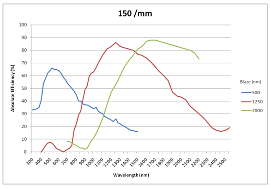 作為光柵衍射入射光多色光,它不具有均勻效率這樣做。 衍射曲線的整體形狀主要取決于凹槽面角,否則稱為閃耀角。利用這一性質,可以計算出該閃耀角將對應于該峰值效率; 這就是所謂的閃耀波長。 這個概念如圖2-1所示,其中比較了三種不同的150克/ mm的光柵閃耀在500nm,1250nm和2000nm的。