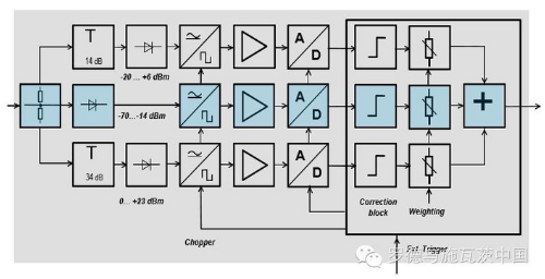 R&S新型功率探頭NRP-Z系列巧妙地采用了三通道的測(cè)量方式來(lái)提高動(dòng)態(tài)范圍。三個(gè)測(cè)量通道能夠提供高達(dá)93dB的動(dòng)態(tài)范圍,低至-70dBm的測(cè)量下限。這種多通道功率探頭,傳統(tǒng)的測(cè)量方式是針對(duì)不同功率大小的信號(hào),功率探頭采用不同的通道去進(jìn)行測(cè)量,當(dāng)被測(cè)信號(hào)功率有大幅度改變的時(shí)候,通道之間采用直接切換的方式,將測(cè)量通道換成下一個(gè)通道。這樣的方法可以有效的擴(kuò)展動(dòng)態(tài)范圍,但是會(huì)產(chǎn)生額外的問(wèn)題,例如滯后效應(yīng)、不同通道的線性度不一致等。