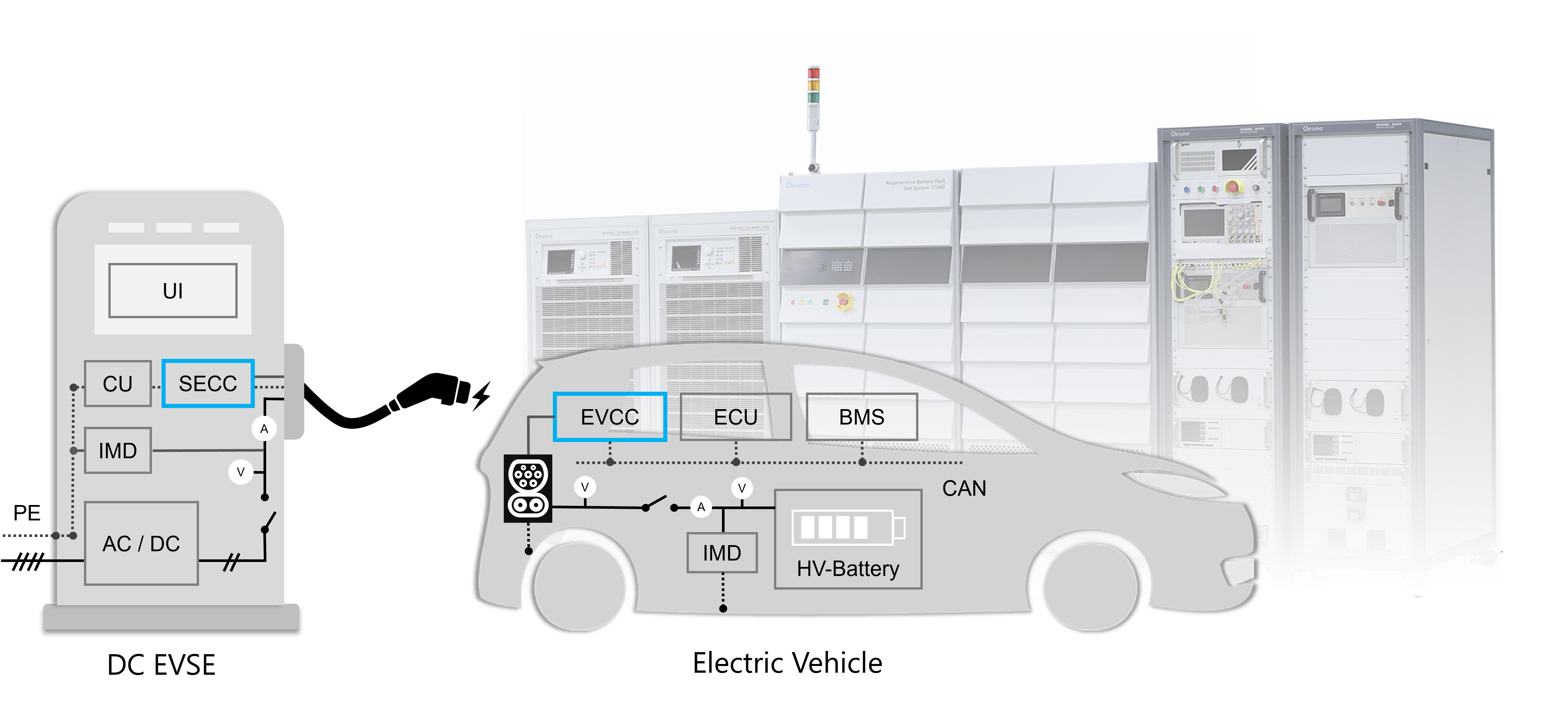 當充電槍插上電動車的充電座之后,雙邊的接觸偵測與通訊協議就開始運作。當在充電預備、開始和結束的各狀態中,若充電設備通訊控制器(SECC)和電動車通訊控制器(EVCC)交握有任何異常(包含超時、資料格式辨識、異常處理、時序等),充電運行就將會被迫中斷。所以自動化測試系統(ATS)必須具備模擬電動車通訊的功能,甚至可以故意設定異常動作,以驗證充電樁的中斷保護功能。另外ATS還需模擬電動車的充電座,規格必須能符合電氣測試之要求,且具備電子鎖、溫度監控、大功率斷路器以及散熱功能,可確保測試過程的安全性。測試系統建議采用模組化且可更換的EV模擬器與充電座,可快速更換避免產線因異常問題造成長時間測試中斷。另外好處是可彈性調整測試不同標準的產品,或未來需求而升級。