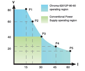 定功率范圍下提供寬廣操作 62000P系列直流電源供應(yīng)器提供寬廣的操作范圍。例如,62012P-80-60的輸出規(guī)格為 1200W/80V/60A可于不同的組合中靈活操作如圖右側(cè)所示。如普通的直流電源電源供應(yīng)器顯示提供所有的輸出電壓相同的額定電流,而62000P于低輸出電壓時提供較大的電流。這表示低電壓/高電流及高電壓/低電流兩者的待測物可使用單臺直流電源供應(yīng)器測試輸入穩(wěn)定度,于一般的ATE系統(tǒng)內(nèi)部避免多臺直流電源供應(yīng)器以節(jié)省成本與空間。